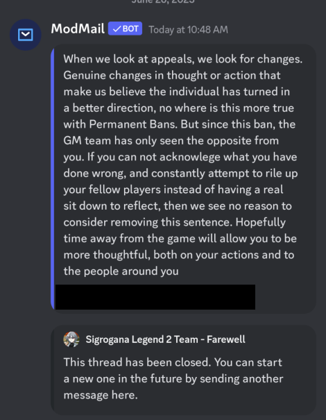 What I found so far - and I repeat, bare minimum I could dig up - was a few forum posts regarding the ban in question, which was placed to be a week long ban. This was from three months ago. Since I really wanted Croakie back into it since I always enjoy having a good time with my friends and that I was also really convinced that the community as it was now was pretty welcoming, I figured that the 3 month time was a good amount enough to reflect and change, and even Croakie herself acknowledged that she made some fatal errors to move past. That much faith I had in Croakie about it. So I sent a modmail about it and wanted to ask why this decision was made to make it go from a week to permanent. Granted, that isn't how modmail works, and that is on me for mistaking it. What came after however was by far one of the most indignant conversations I have been met with in this community before.